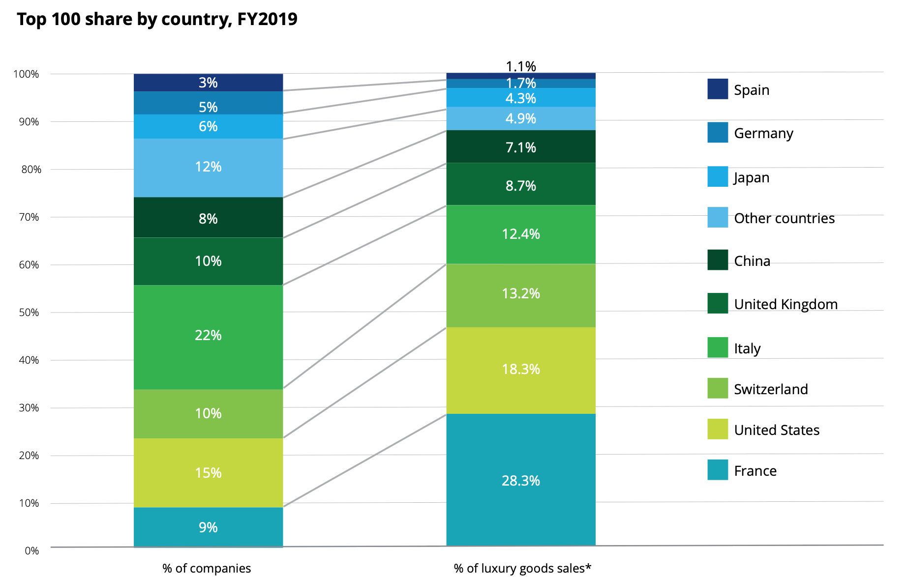 - 上榜的意大利奢侈品公司数量最多;法国公司表现最佳,销售额复合增长率为15.7%,在100强中销售额占比最大,达到28.3%;
