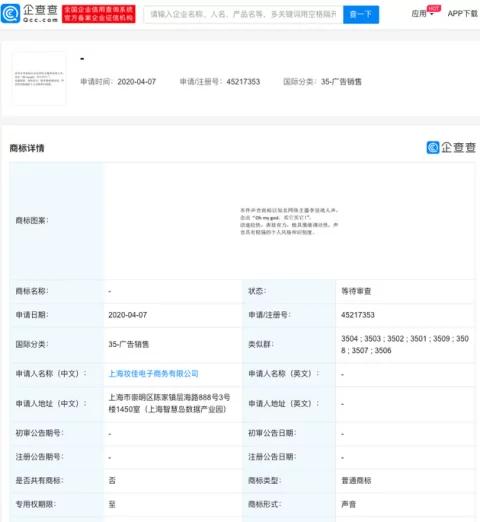 据企查查数据显示,4月7日,上海妆佳电子商务有限公司申请注册声音商标“oh my god,买它买它!”,目前状态为等待审查。