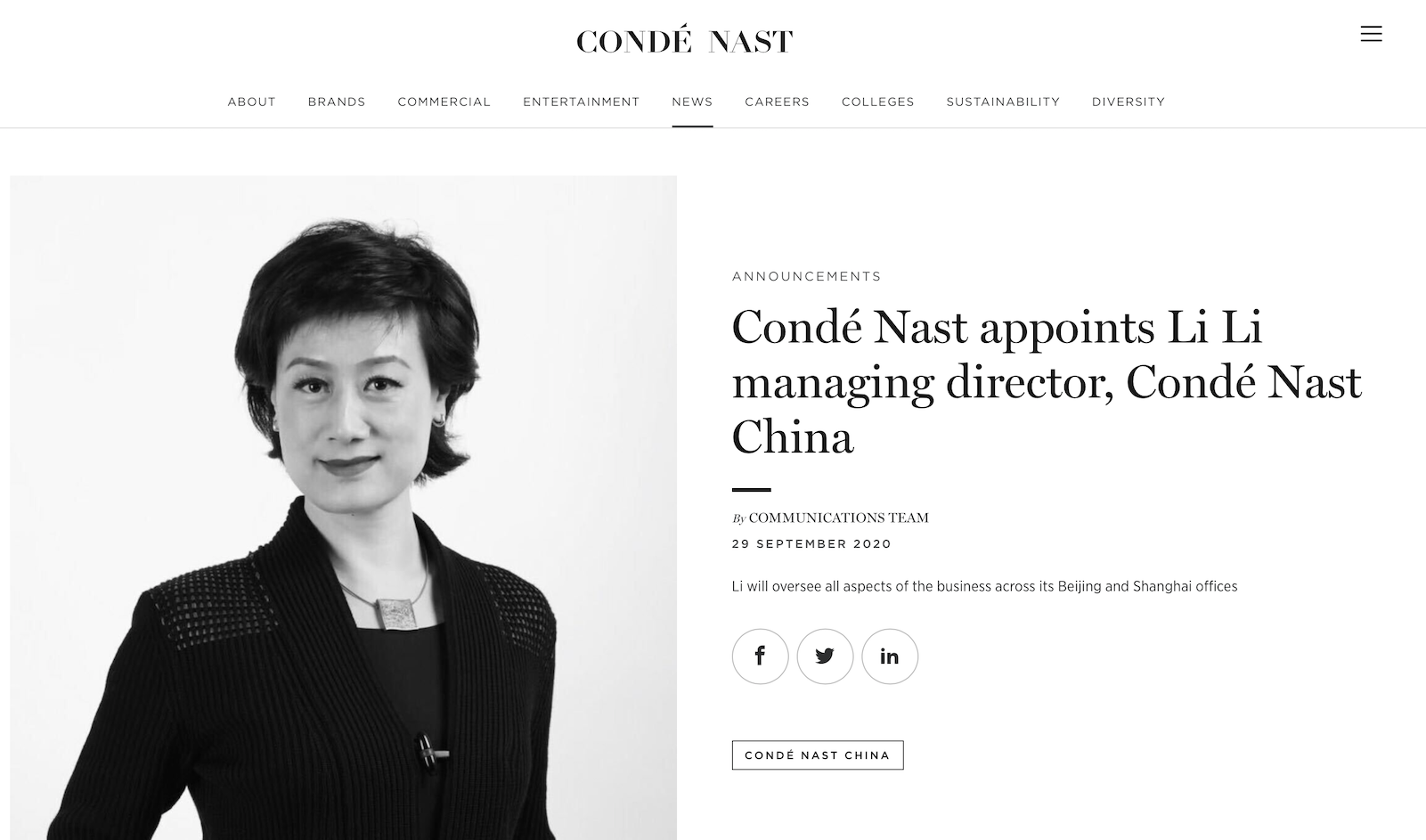 国际出版业巨头康泰纳仕(Condé Nast)日前宣布,任命李莉(Li Li)为康泰纳仕中国总经理,该任命于10月12日生效。