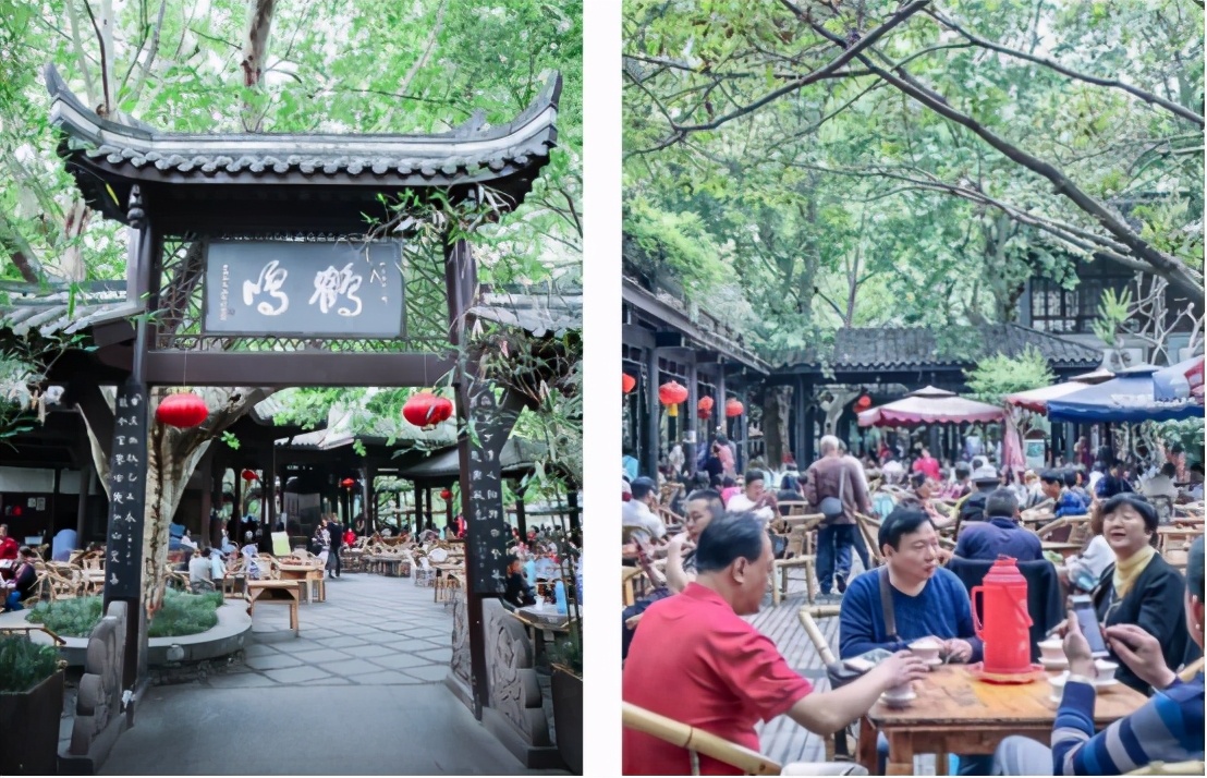 ▲成都茶馆的标配:竹椅,矮桌,盖碗茶,绿树成荫,和晒着太阳聊天搓着麻将的老茶客们。而创建于民国时期、将近百年的历史的鹤鸣茶社是最具川西民俗风味的茶馆之一。