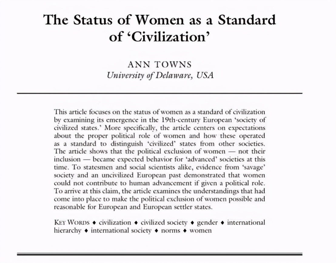 美国特拉华州大学教授ANN TOWNS专门写过一篇社会学的学术论文讲述一个城市的女性地位高为何会代表这个城市更文明。