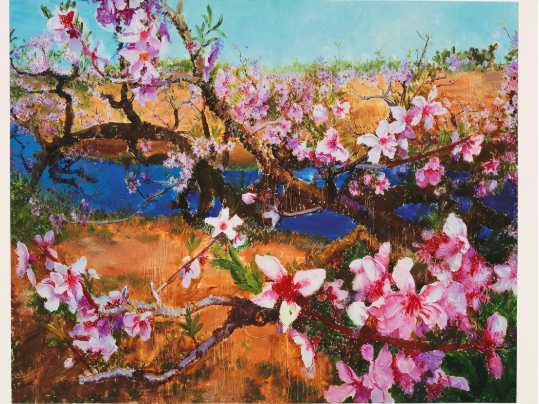 ▲周春芽曾经说:”我画的大家很熟悉的题材——桃花,也是在成都获得的灵感。成都有龙泉山,春天一到,满开桃花,3月,人面桃花,形容大家的身心愉悦,人刚好在过冬之后,走出户外,呼吸万象新鲜。桃花的盛开,其实与人性那一面相融通,春天始终能唤起人性的一些东西,比如对生活的热爱。桃花为什么能感动我,首先我是热爱这个地方的生活,才能感觉到桃花这种气息。”