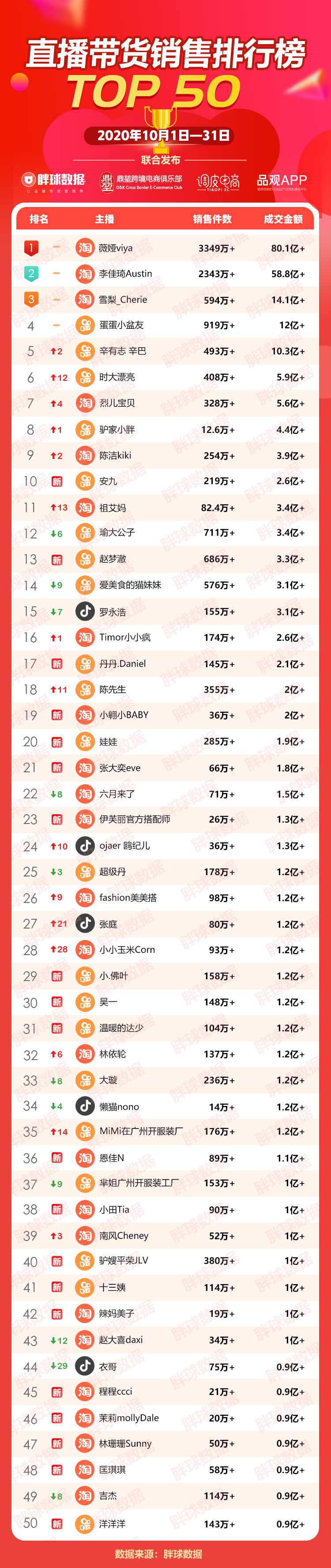10月直播带货TOP50榜单总销售额:258.77亿;