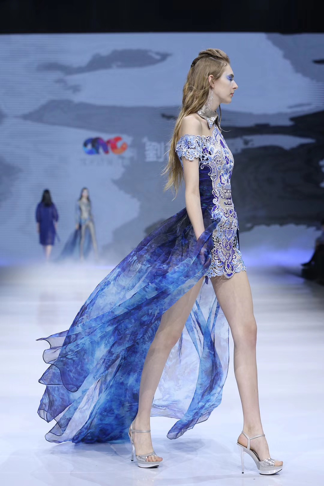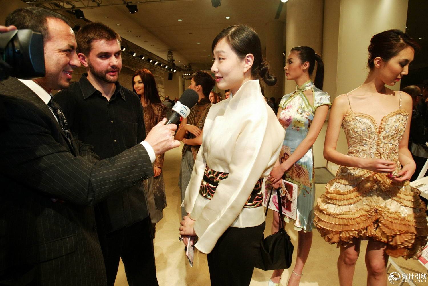 著名服装设计师罗峥发布会前身着东方风韵的服装接受外国记者采访