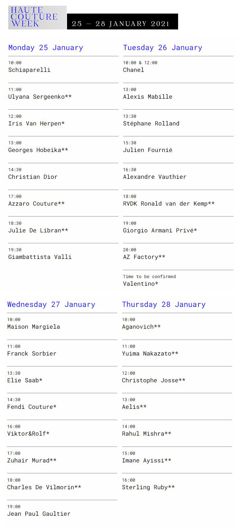 本届巴黎高定时装周将以 Schiaparelli 开场,以 Sterling Ruby 压轴。新加入的品牌包括: Sterling Ruby、Charles de Vilmorin、Julie de Libran、RVDK Ronald van der Kemp、Aelis 和 Imane Ayissi。此外还有一批巴黎高定周的常客: Dior、Chanel、Valentino、Giorgio Armani Privé、Maison Margiela、Elie Saab、Viktor & Rolf、Iris van Herpen 和 Giambattista Valli 等。
