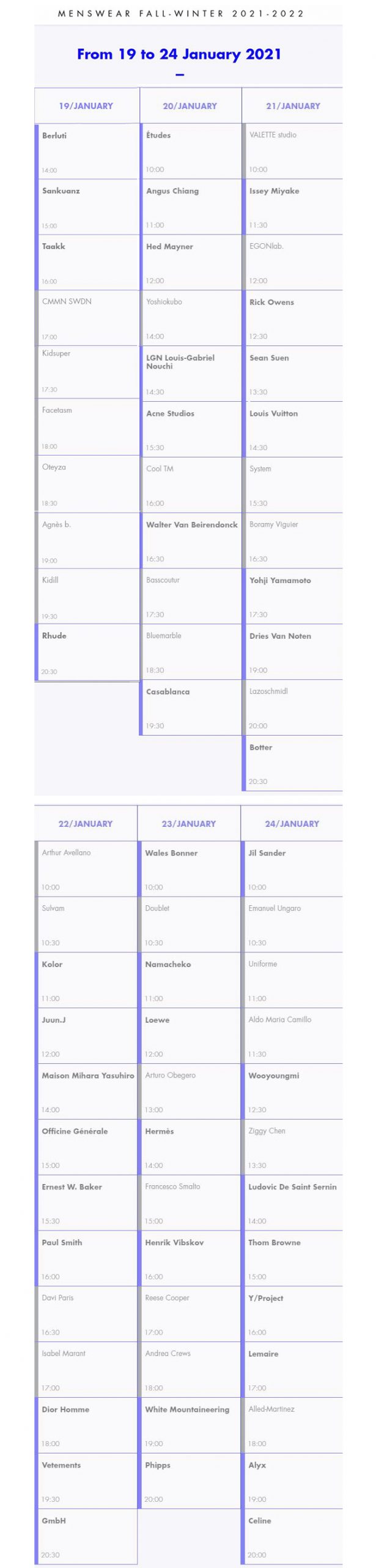 附:巴黎男装周日程表(灰色非加粗字体代表静态展示):