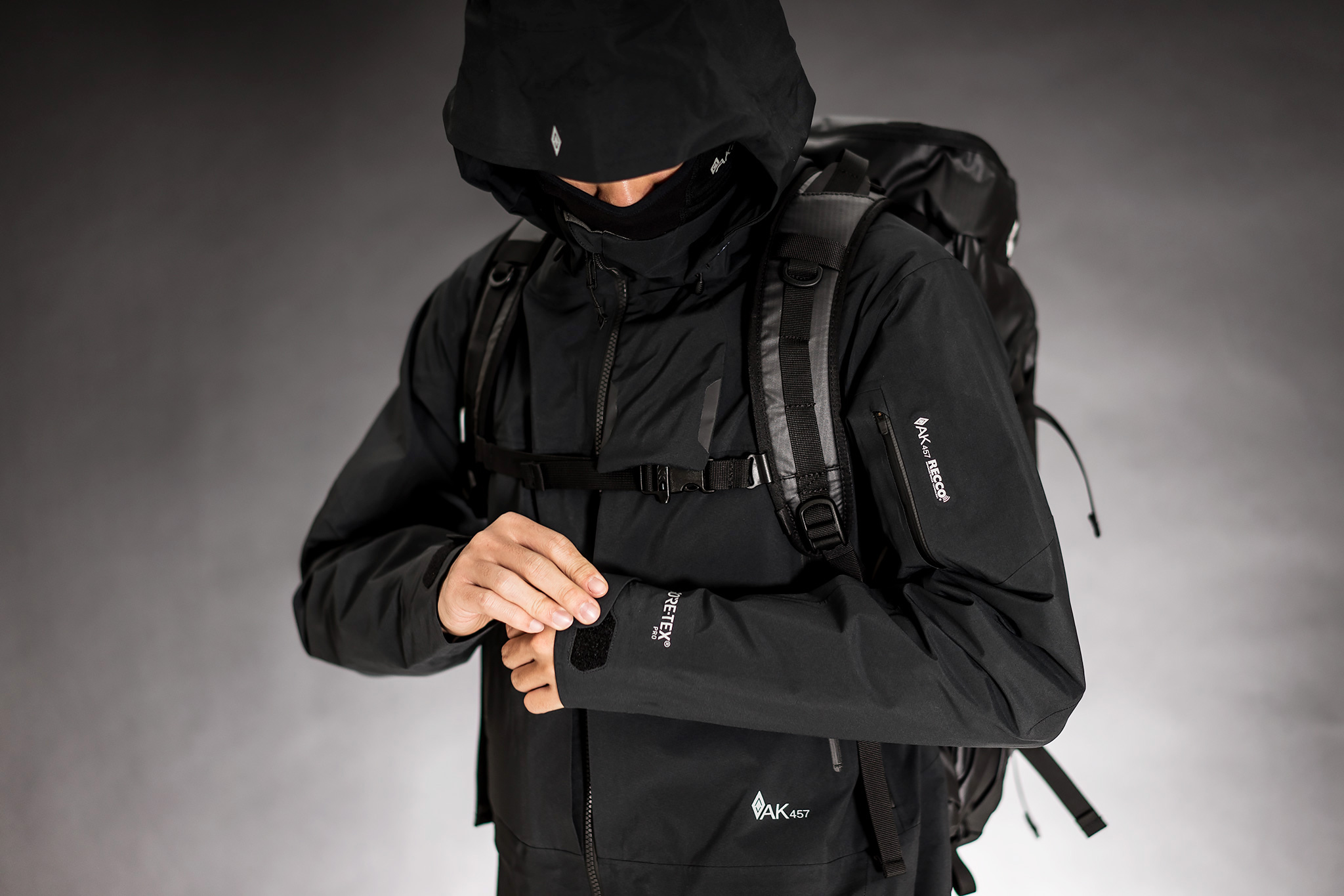 系列选材上使用了兼具 45K+WP 防水等级与 0.5 RET 透水性的 Sympatex 可回收面料,无缝密封技术和 Primaloft 绝缘工艺,并搭载 Recco 雪崩报警器。