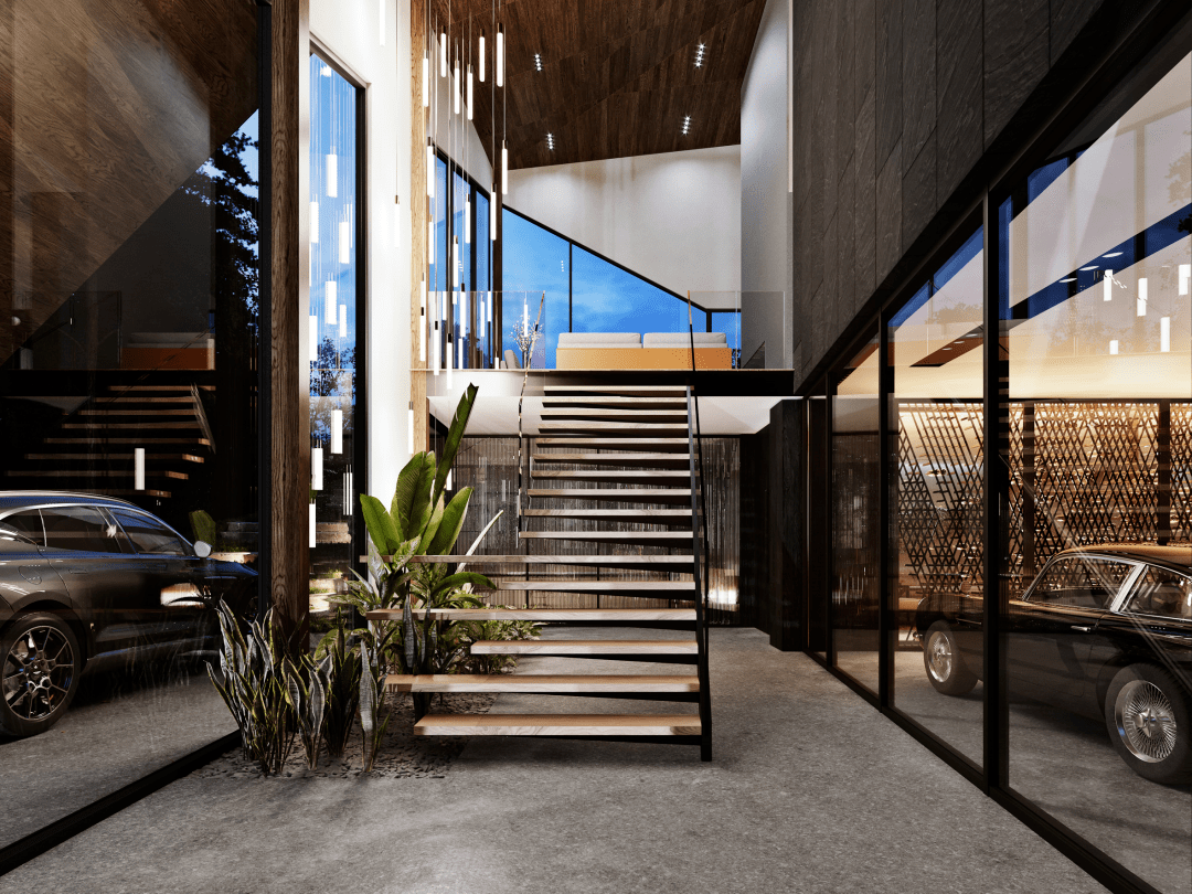 项目总占地 783㎡,包括住宅主体、凉亭、户外泳池、树屋,以及周边花园景观。居住面积 555㎡,设有 4间卧室,6个卫生间,售价 770万美元。有一条长 609 米的车道蜿蜒通向房子的正门,宽敞的车库可以容下4辆跑车。