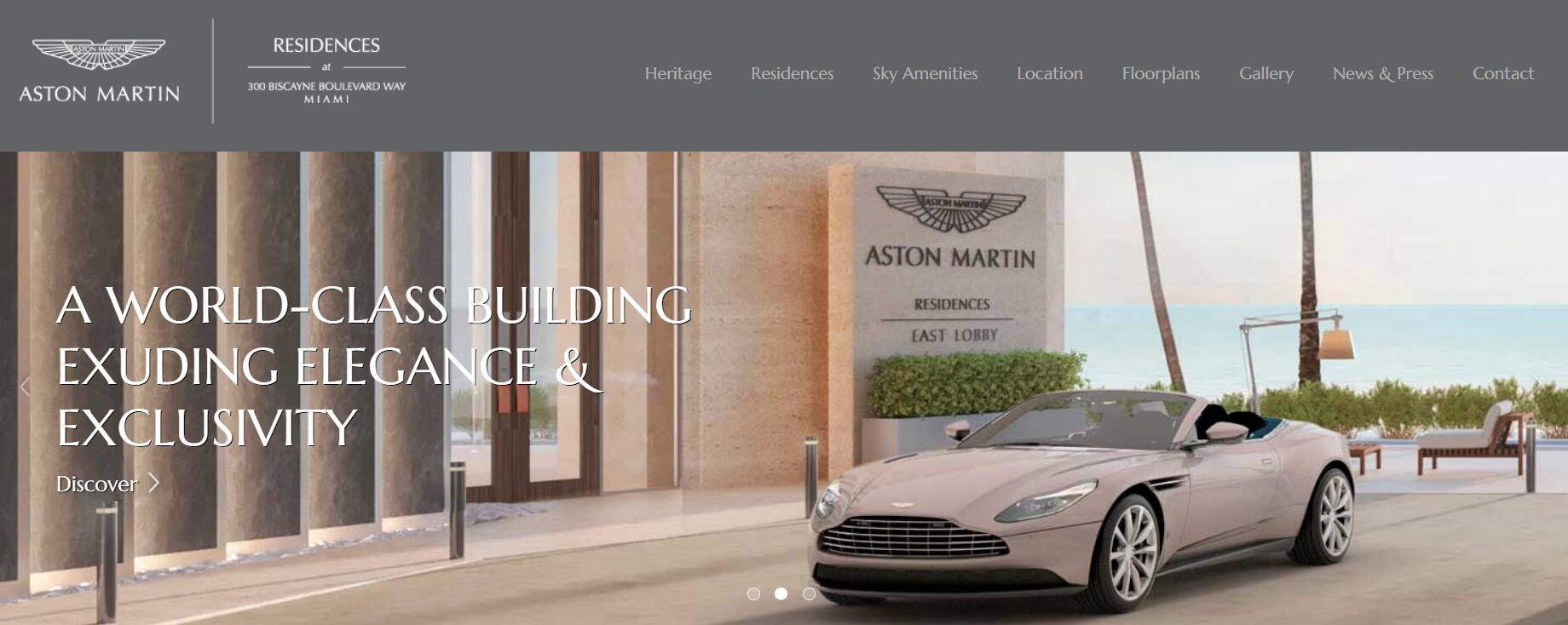 阿斯顿马丁目前正在联手房地产公司 G&G Business Developments 在迈阿密比斯坎大道300号(300 Biscayne Boulevard Way)建造一座住宅大楼 Aston Martin Residences,这是阿斯顿马丁的第一个房地产项目。该项目最早宣布于2017年,2019年开始建设,将在2022年竣工。由 Revuelta Architecture和Bodas Miani Anger 设计,将成为纽约市以南最高的住宅建筑,高250米,66层。共391户,每户面积65至1760平方米不等,售价75万美元到5千多万美元不等(顶层97万美元起)。