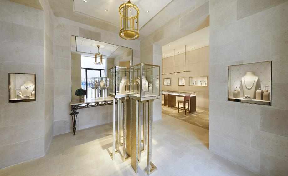 Louis Vuitton 2012年在旺多姆广场2号开设了一家高级珠宝独立精品店;2017 年,该店完成了翻新工程,由品牌御用建筑设计师 Peter Marino 操刀设计。翻新后,这座五层的建筑顶楼设立了专门的高级珠宝工坊(下图),向客户展示每件作品的严谨制作过程;旗舰店一楼展示高级珠宝成品作品。