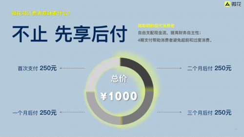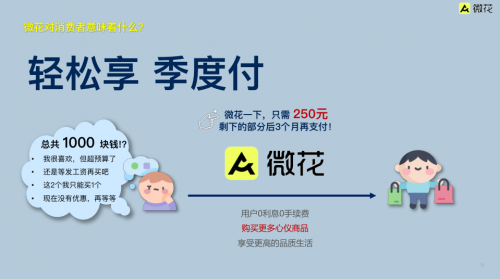 和这一类产品相比,微花提倡一种“轻松享,季度付”的聪明的消费理念,一方面以4期支付,无任何附加费用的消费方式,让消费者能以更低的成本提前获得想要的物品,更精准地迎合新生代消费者提前追求品质生活的需求。另一方面,微花也倡导合理、健康的消费,利用大数据技术对不同用户进行信用评估后配置合理额度,通过控制分期笔数和额度来帮助消费者避免过度消费。更值得一提的是,微花超长90天0费用的消费体验,可以让消费者提高财务自主性,更自由地支配现金流,同时,也养成周期理财的好习惯,真正实现“轻松享,季度付”的生活。